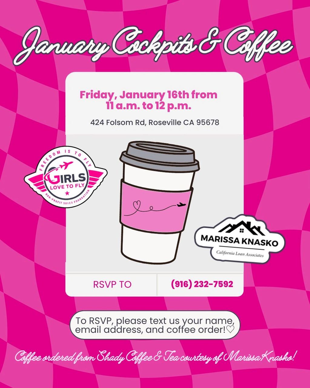 RSVP at (916) 232-7592 with your name, email address and coffee order!